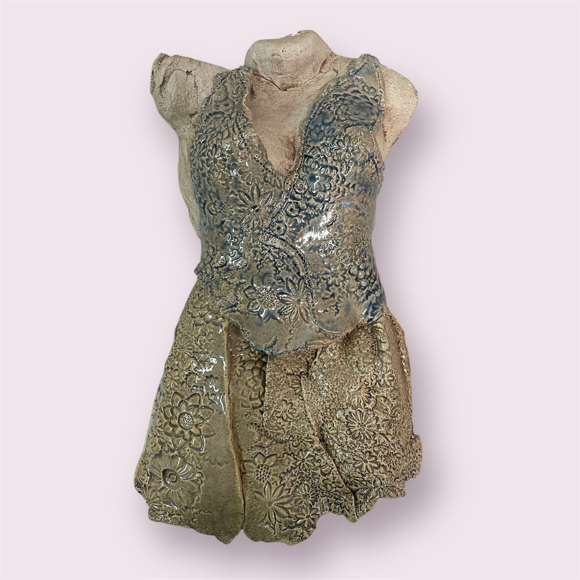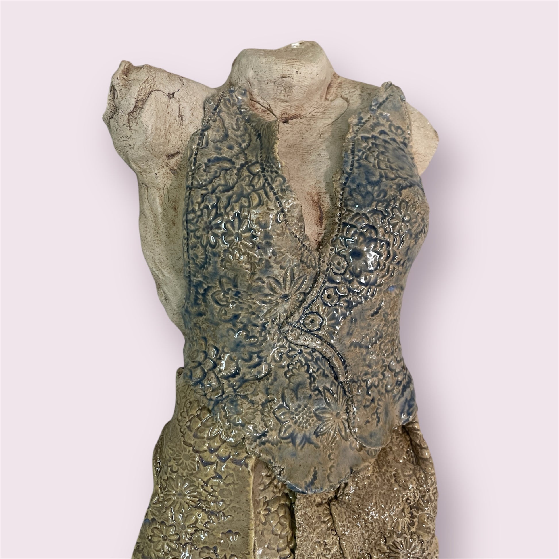 Sculpture of a female torso wearing a fabulous floral dress. Indoor or outdoor wall hanging.