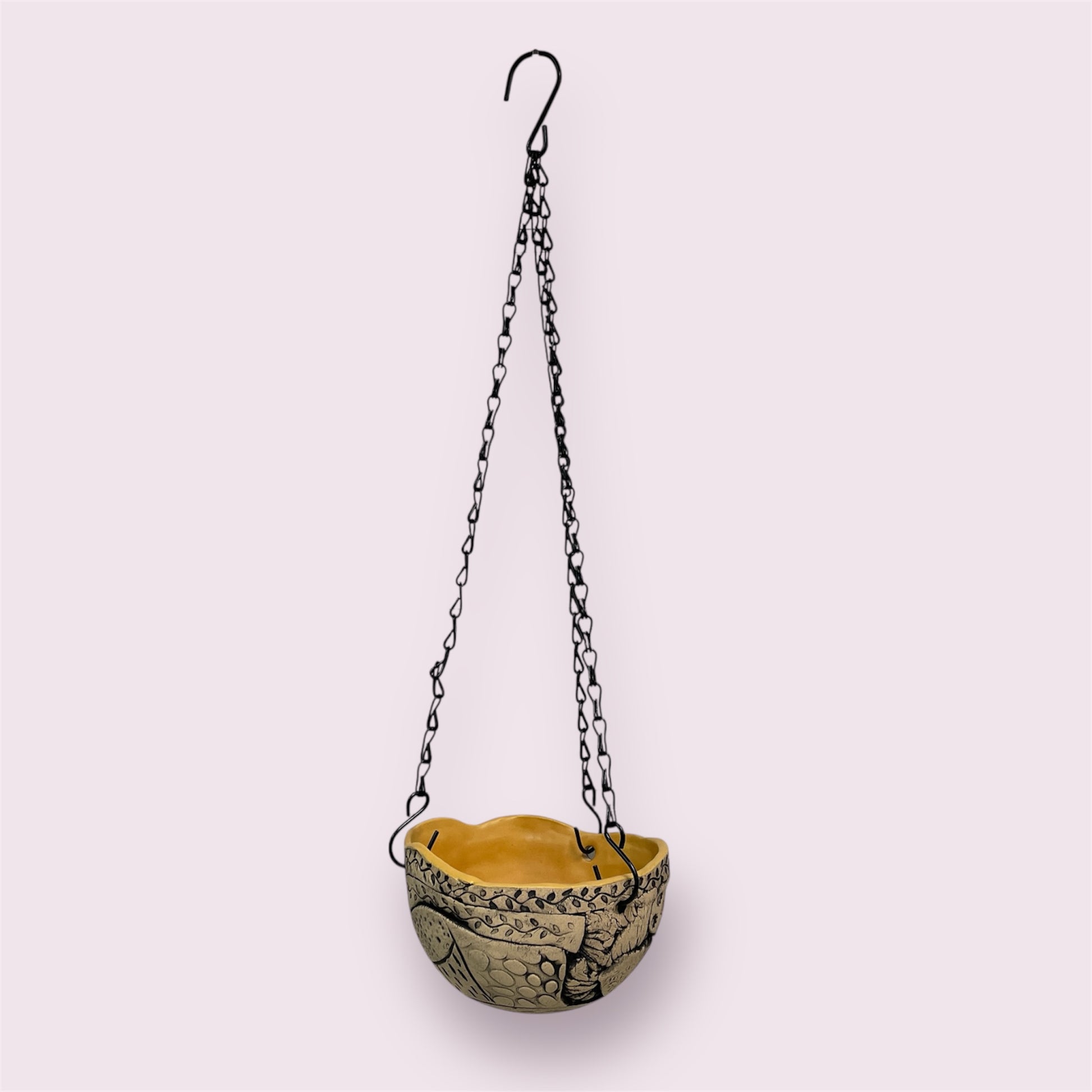Layered and richly textured, with playful prints dancing across the outside in black relief, and a warm golden glow inside. Cute, compact and full of character at just 12cm wide and 6cm deep – perfect for tiny plants, little spaces, or a sunny wall that needs a bit of joy. Small, but definitely not shy.