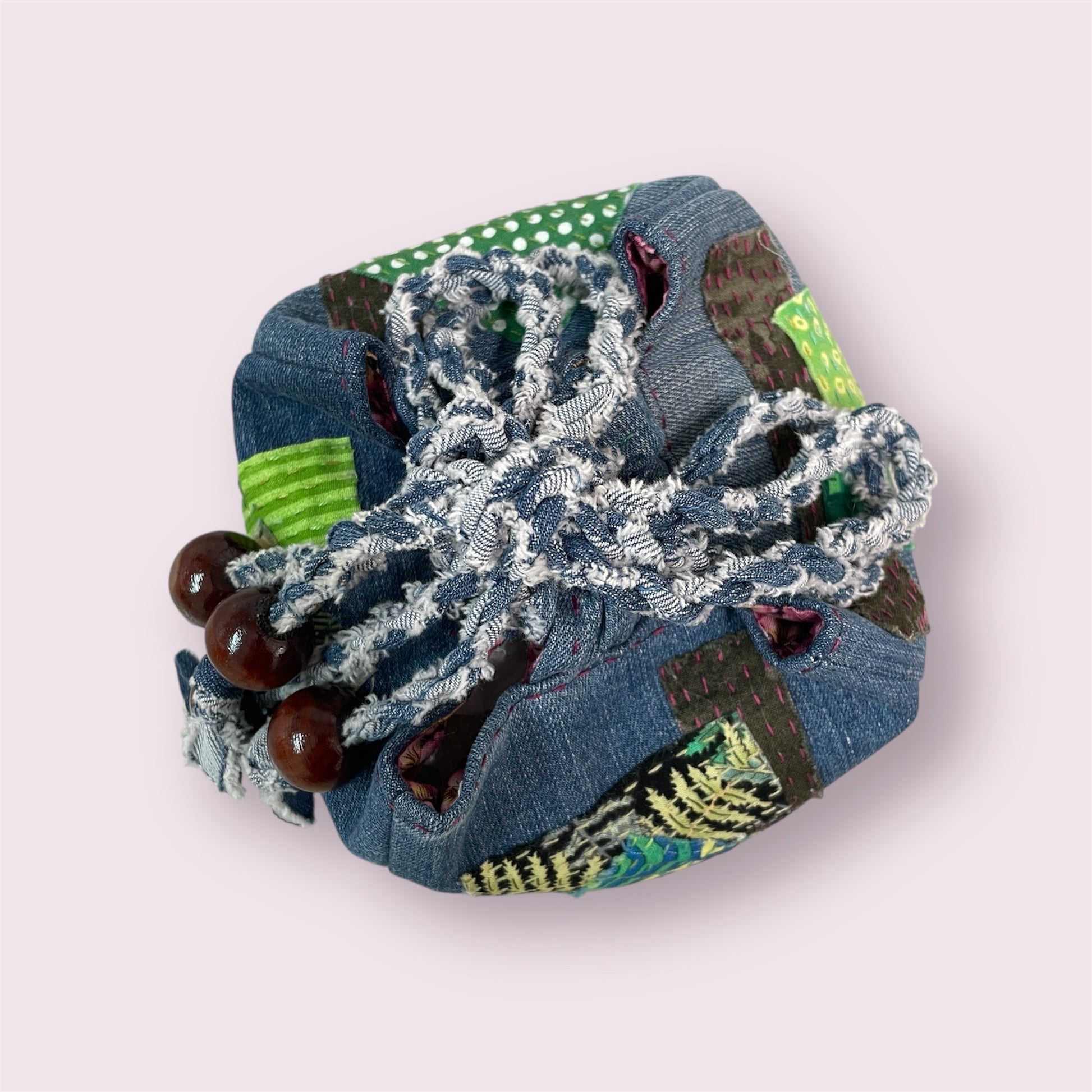 Fabulous small bag made from recycled denim with slow stitching decoration. Lines and with denim pockets. Twisted fabric cord.