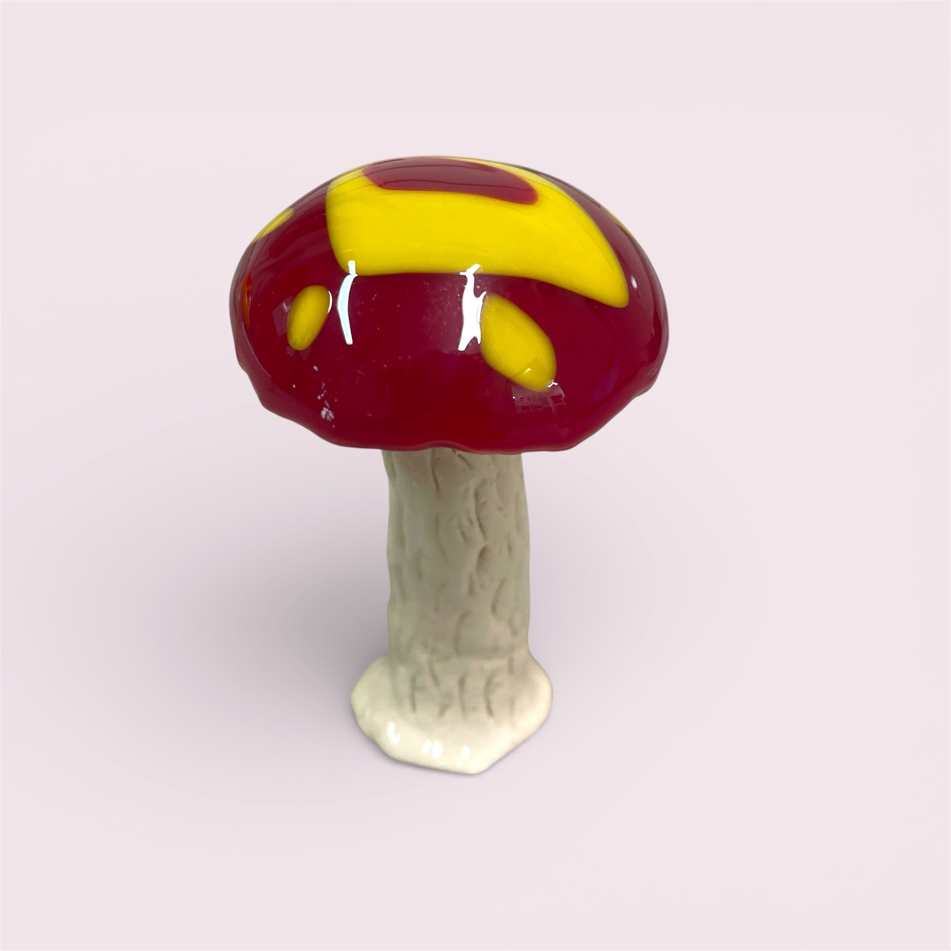 Adorable and colourful fused glass and pottery mushrooms.
